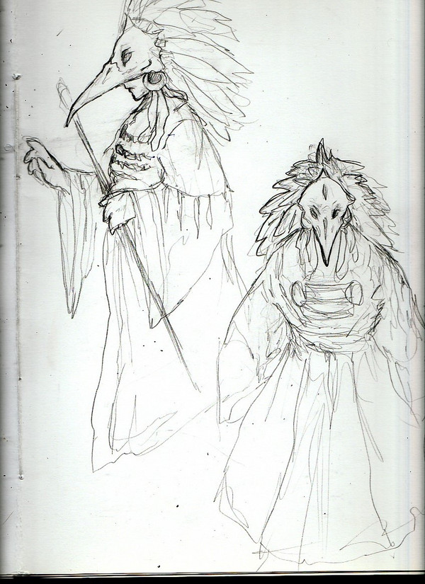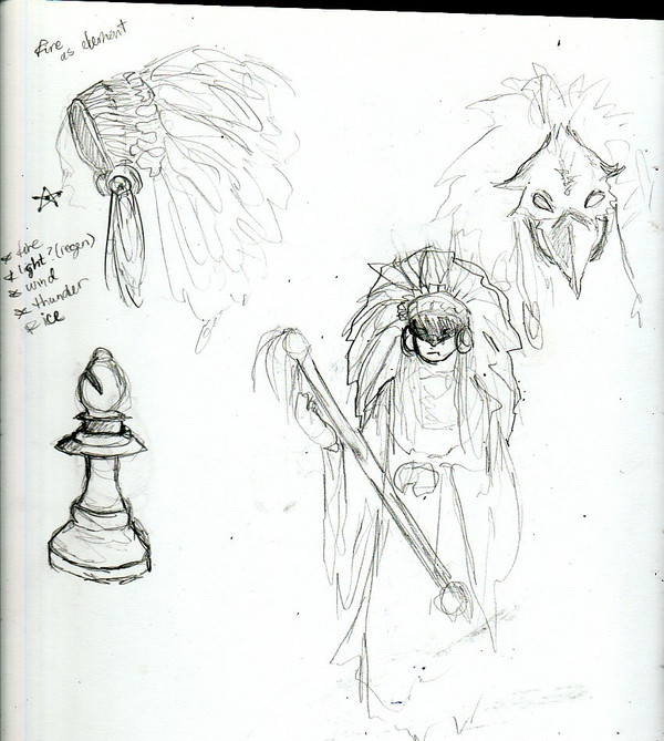 working through some ideas. since this character is native american, wanted to do some iteration on an indian war chief, but in subtle ways. also this character's element is fire, so i can work in some phoenix angle or something with the feathers...