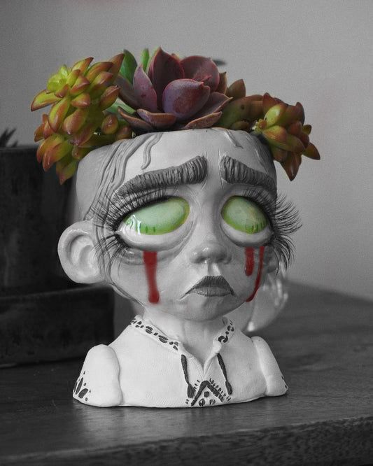 Game Description: Deirdre is a ceramic flowerpot shaped like a mime. She believes she is cursed because every plant she has ever had ends up dying, until one day a seed falls on her head without her noticing, and she feels it growing inside her and believes she has a chance to make the plant feel like it has a safe home. She is willing to suffer in order to keep the plant stable.
