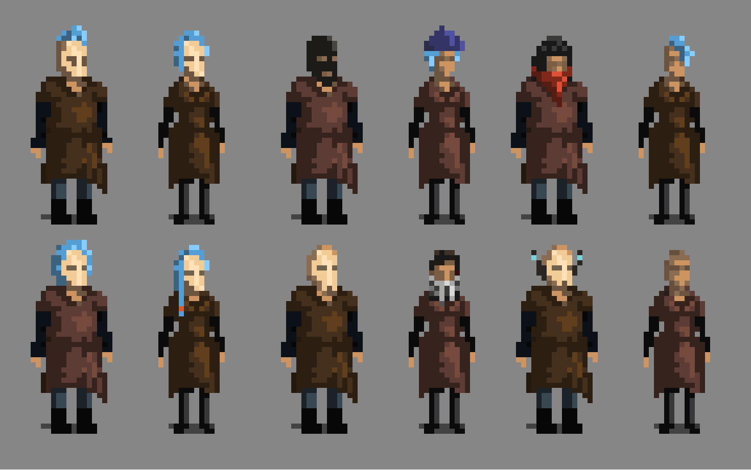 Working on exchanging character parts in Death Trash. Replacing the head is easy so variants like these should soon be in the game.
