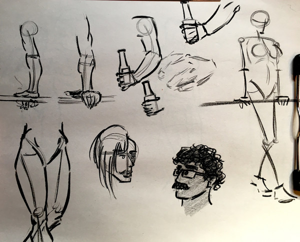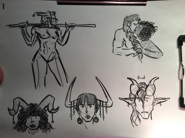 Lots of doodles. Some alt appearances for the gang. Tried a new approach to that pair of drawings from yesterday, trying out each part individually. (I really like how loose I managed to be with those drawings.) Drew some demons. Tried the 'boobs boobs boobs boobs' scene again. (I imagine a lot of trans women have a 'boobs boobs boobs boobs!' moment haha.) ANYWAY.