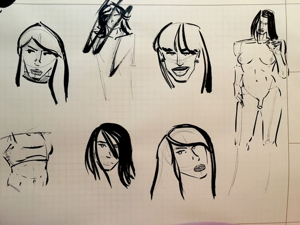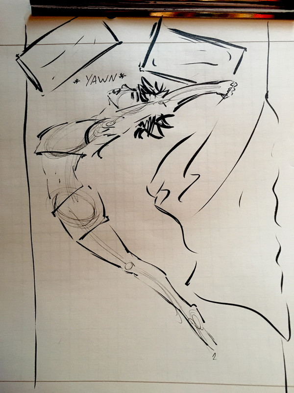 I tried to draw Knife Woman stretching like a cat. Instead she just looks warped.
