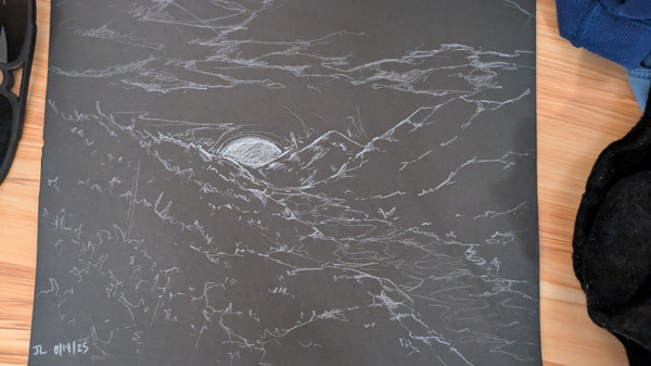 Drew this at an art museum. It was strange drawing on a black canvas but I dig it.The cloud's shading ended up being inverted because I got confused lol